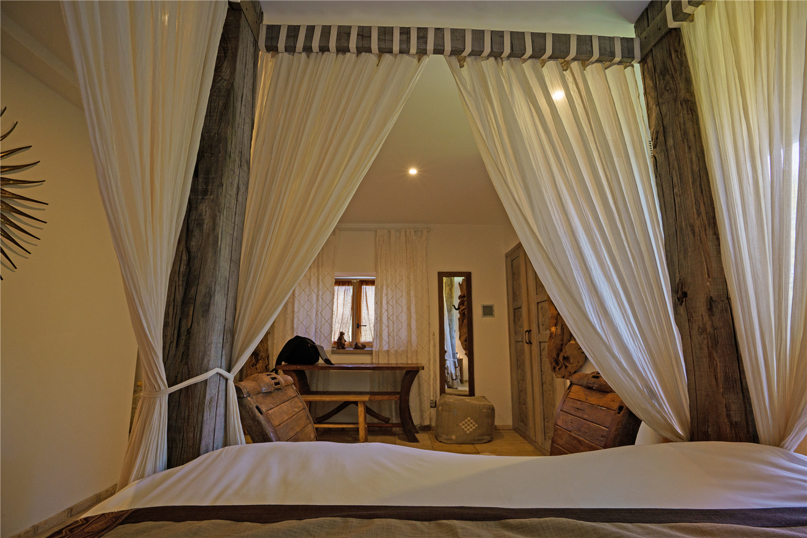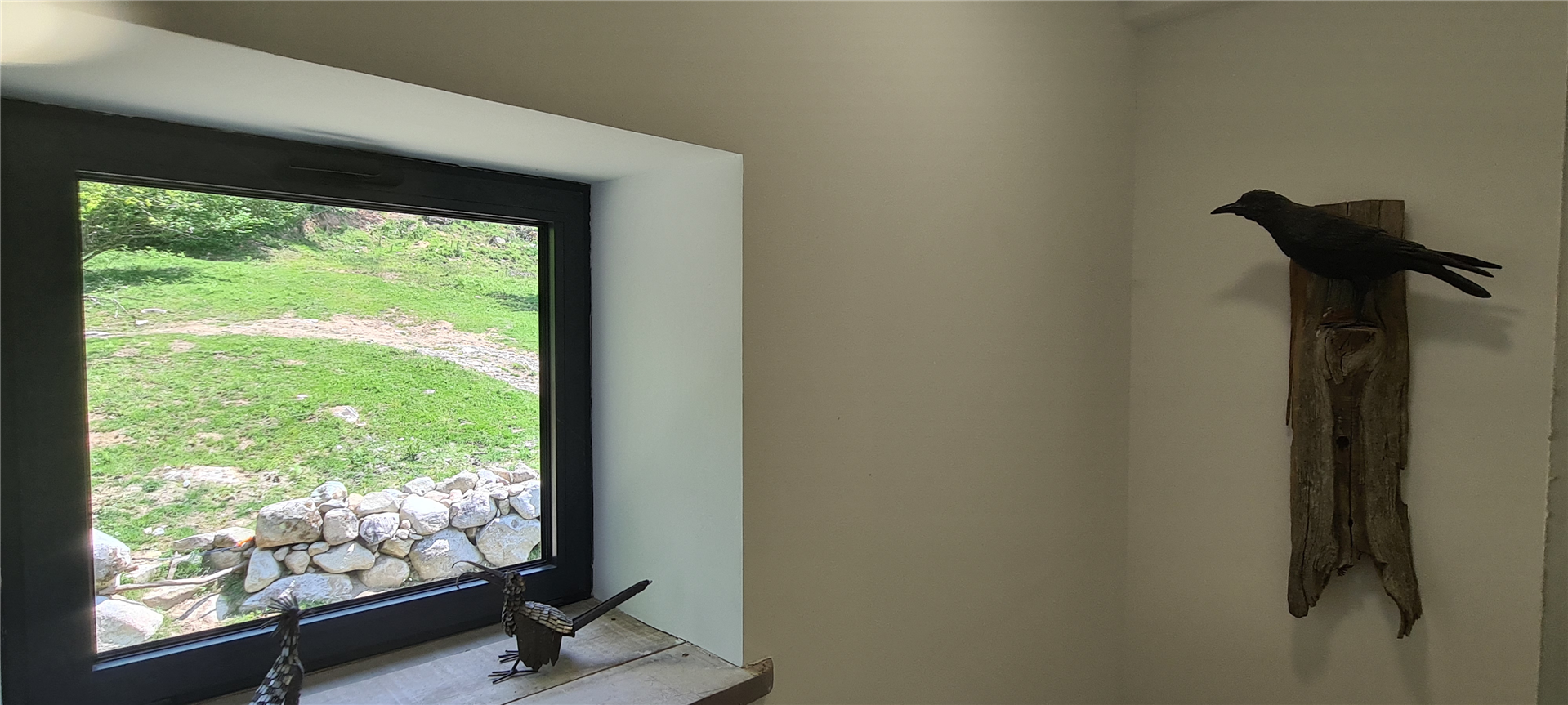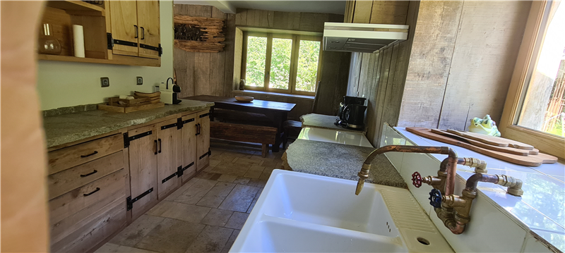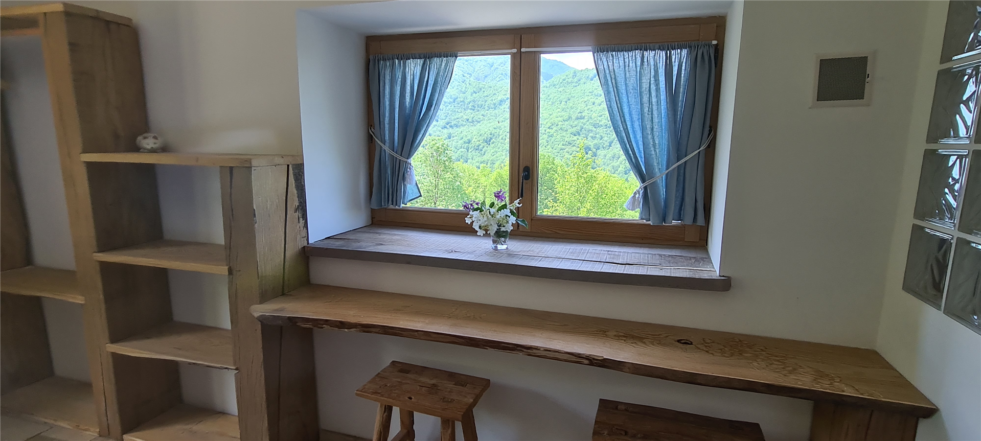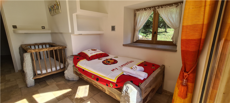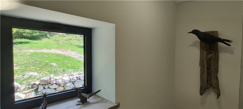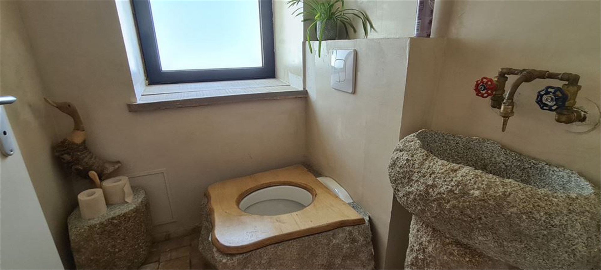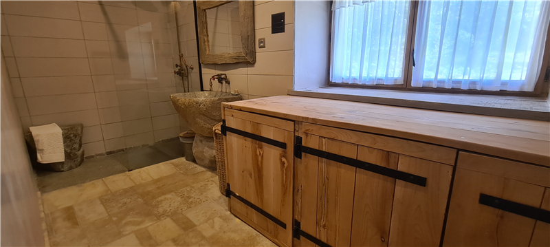 Every room has been imagined and crafted by us. We learned to carve stone and work with wood to build our own beds, armchairs, tables and decorative elements. Some furniture comes from old roof frames, former cow racks or reclaimed barn structures. In the bathrooms, sinks and cabinets are sculpted from granite blocks, making each space truly one of a kind.