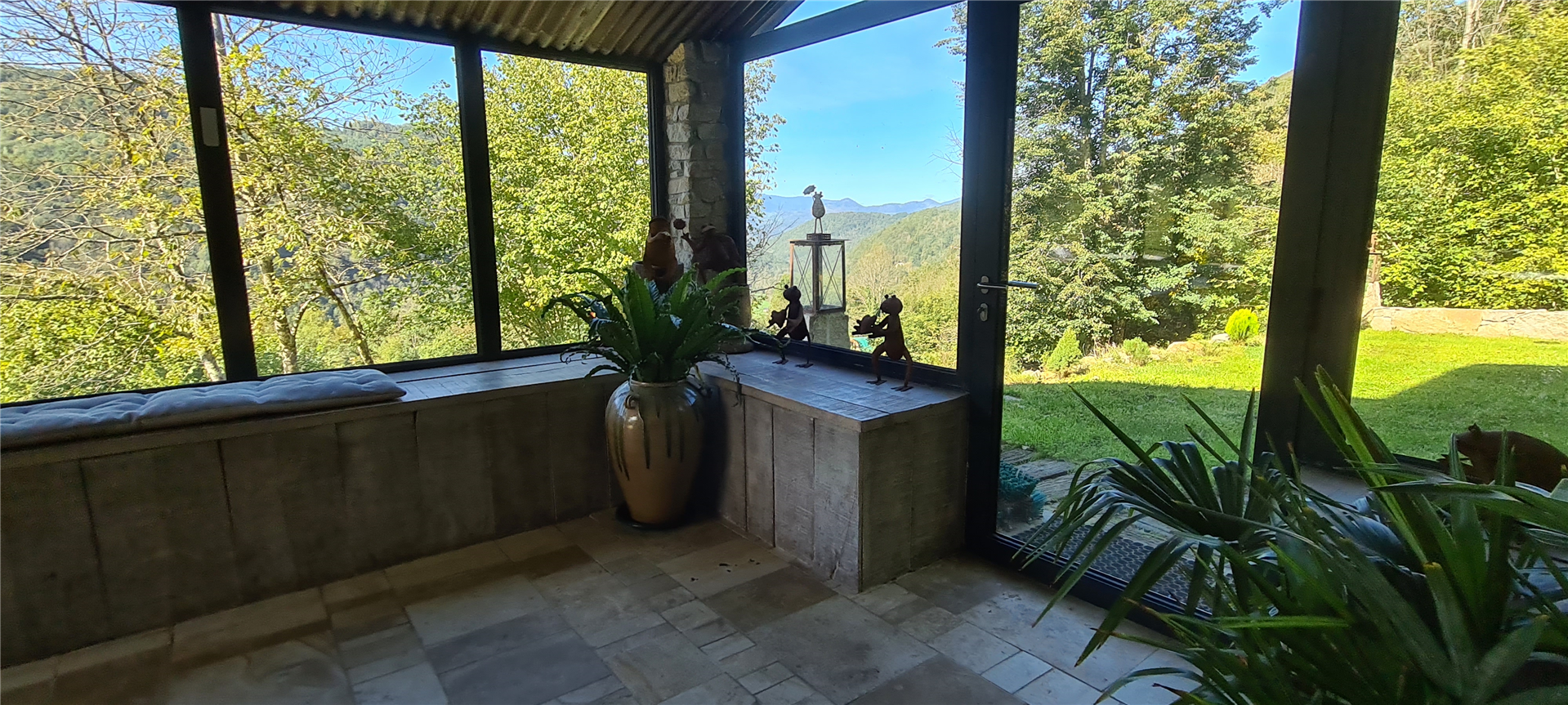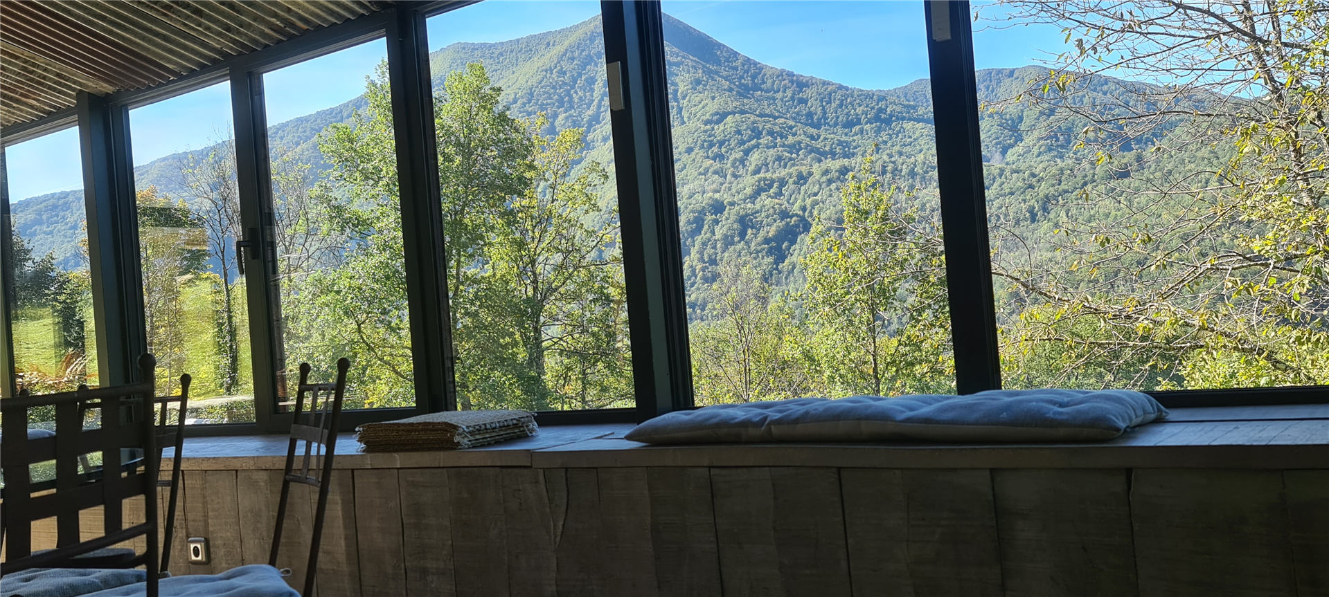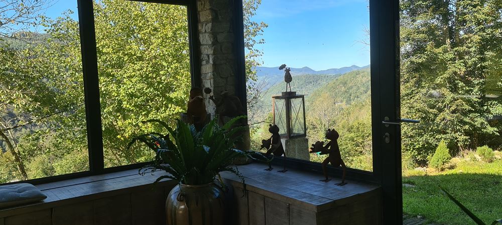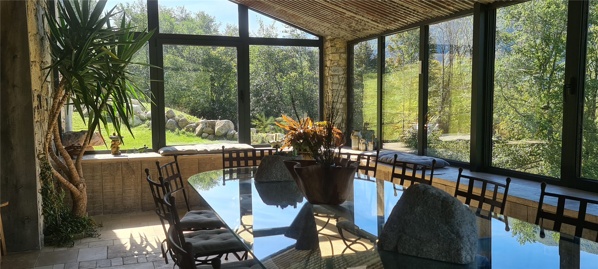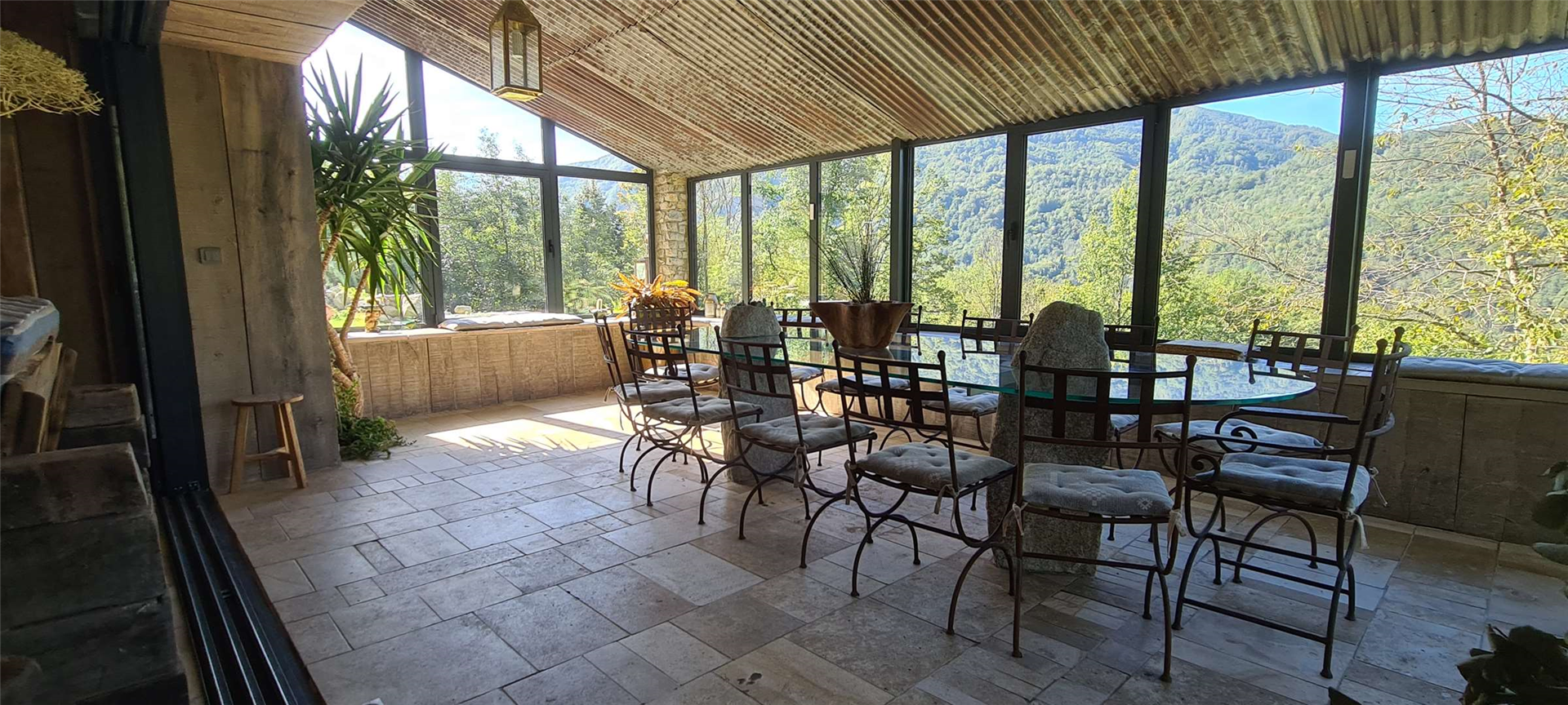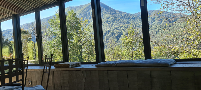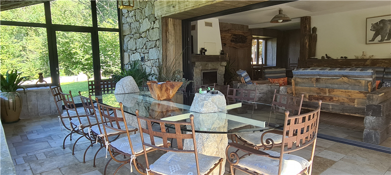 The common areas are spacious and designed to welcome up to 11 guests: a vast, bright living room and a large panoramic veranda fully open to nature.